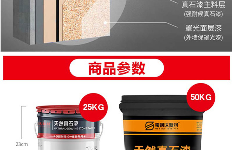 | 配套涂料 | 寶潤達(dá)抗堿封閉底漆 + 天然真石漆 + 長效鎖色罩面漆 | ||